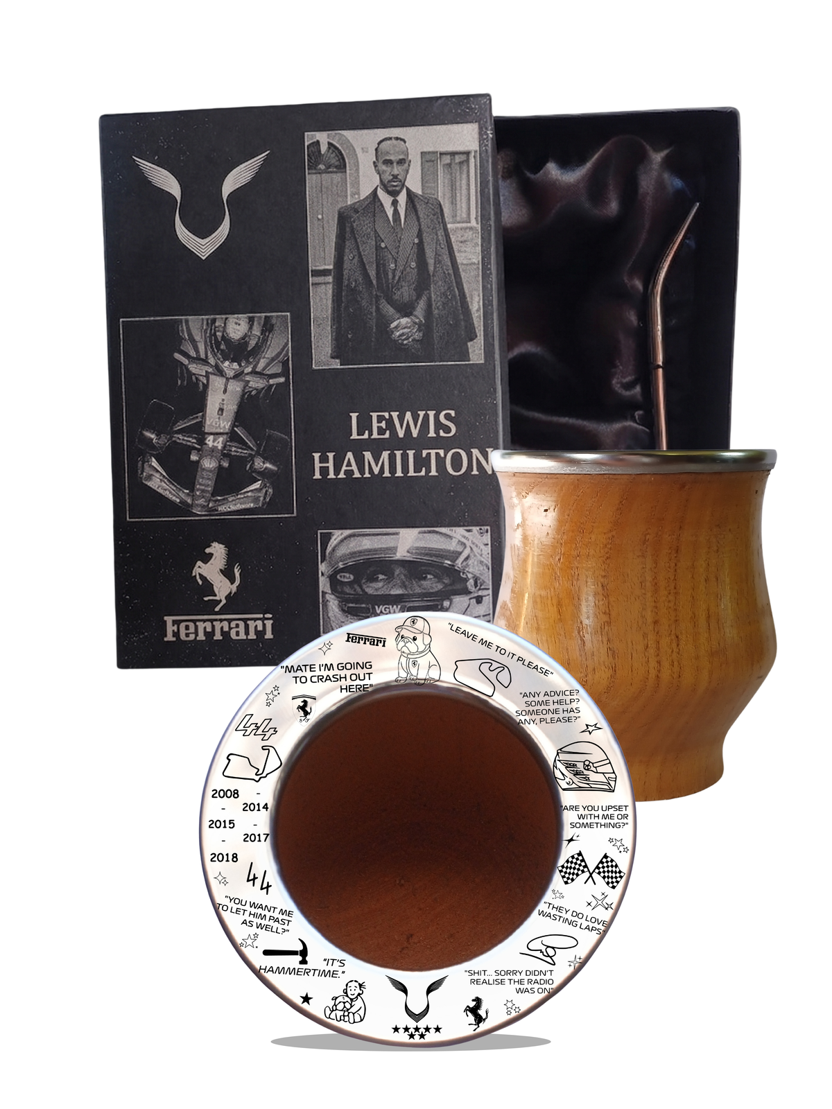 Mate camionero de algarrobo con grabado vectorial de Hamilton. Incluye bombilla de acero inoxidable y caja negra de presentación grabada. Edición limitada F1 2026.