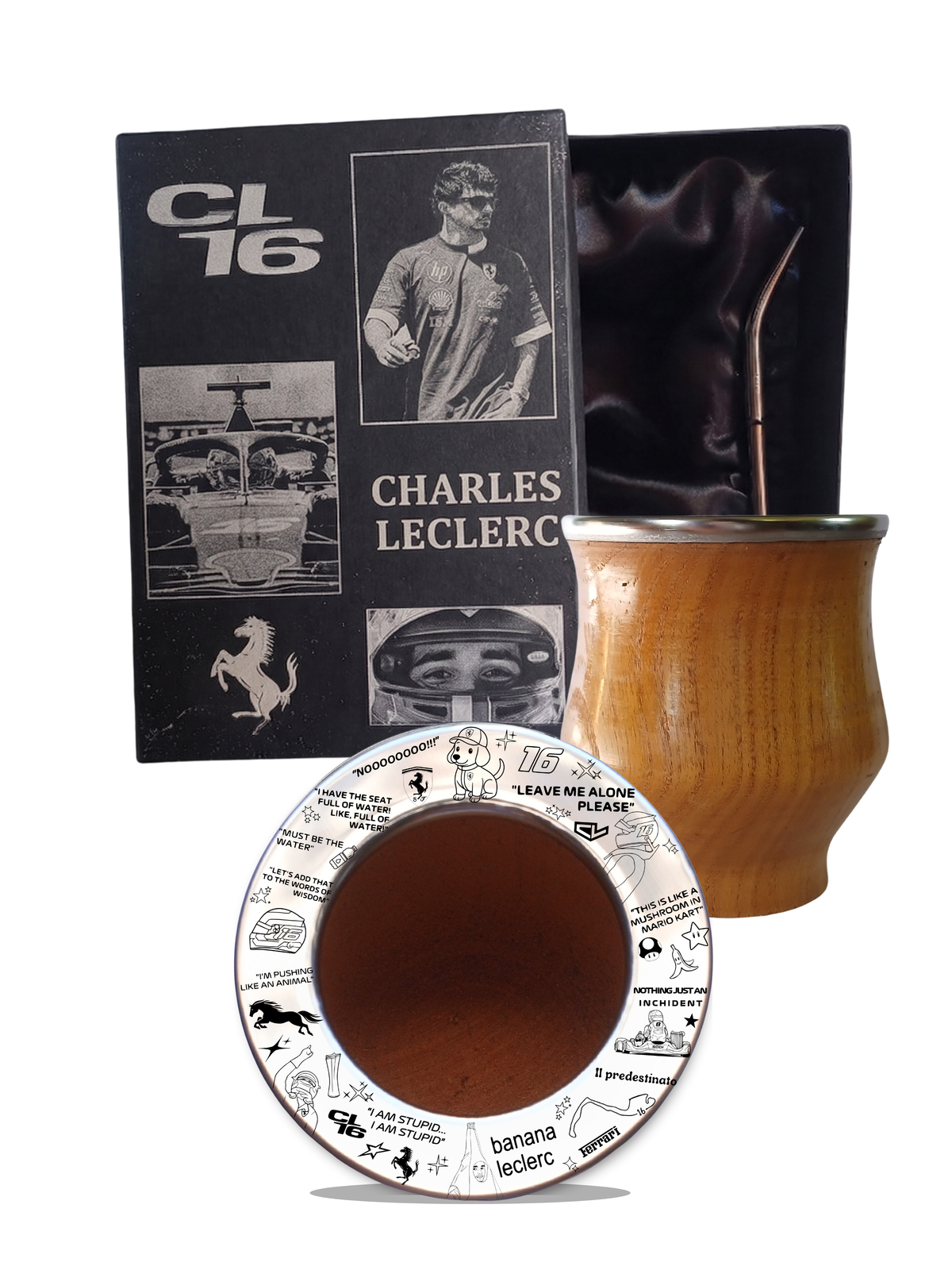 Mate camionero de algarrobo con grabado vectorial de Leclerc. Incluye bombilla de acero inoxidable y caja negra de presentación grabada. Edición limitada F1 2026.