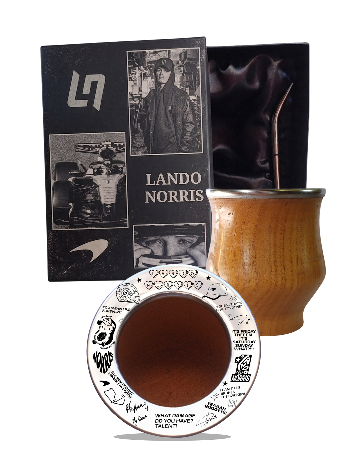 Mate camionero de algarrobo con grabado vectorial de Norris. Incluye bombilla de acero inoxidable y caja negra de presentación grabada. Edición limitada F1 2026.