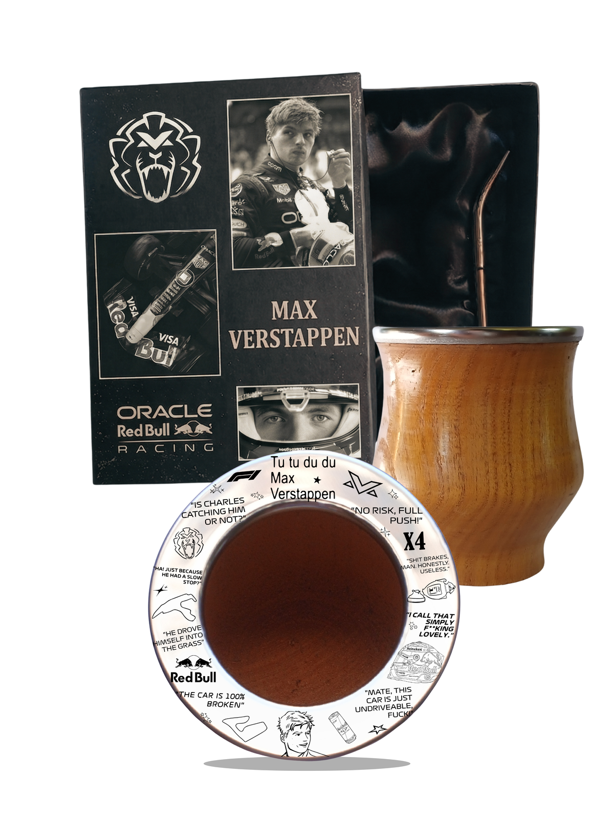 Mate camionero de algarrobo con grabado vectorial de Verstappen. Incluye bombilla de acero inoxidable y caja negra de presentación grabada. Edición limitada F1 2026.